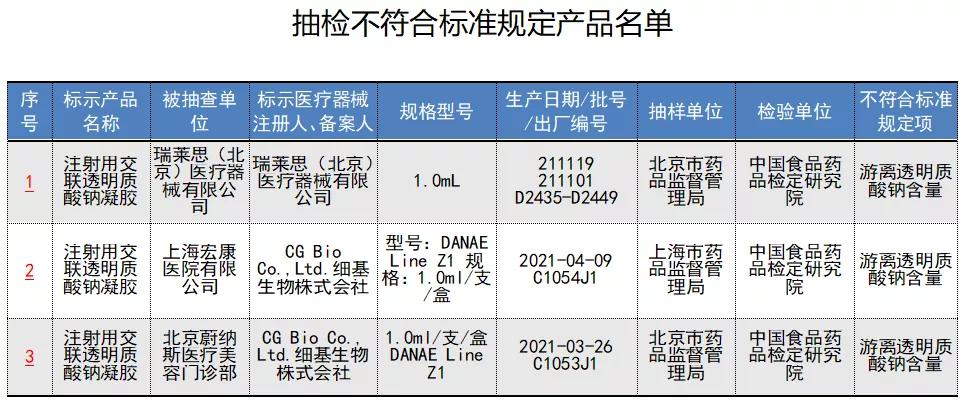 此外,瑞莱思生产的批号为211101的一批次注射用透明质酸钠凝胶也因游离透明质酸钠含量项目不合格。