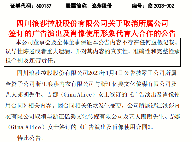 1月4日晚间,浪莎股份公告称,因合同相关条款发生变更,公司全资子公司浙江浪莎内衣有限公司取消与浙江亿燊文化传媒有限公司及艺人郎朗、吉娜(GinaAlice)签订的《广告演出及肖像使用合同》。