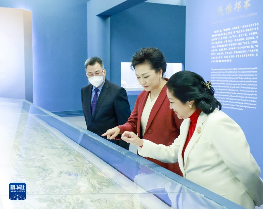 在国家博物馆馆长陪同下,两位元首夫人一同参观了由中国国家博物馆和故宫博物院联袂推出的“和合共生——故宫·国博藏文物联展”。展厅陈列的青花开光花鸟图菱花口折沿盘等400余件中国历代文物藏品精美绝伦,生动展现了中华文明深厚的历史底蕴和中华民族“尚和合、求大同”的价值追求。