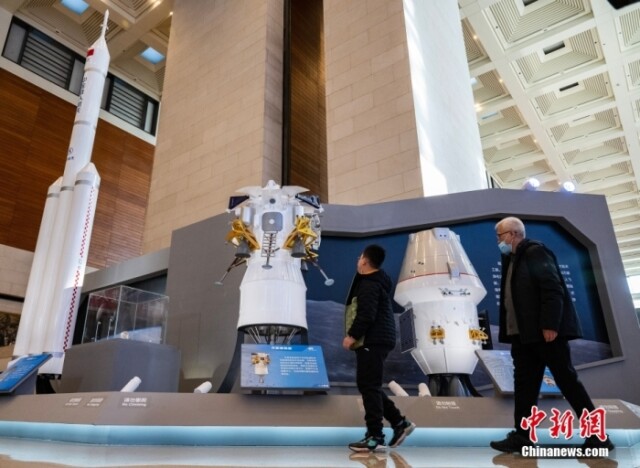 2月24日,“逐梦寰宇问苍穹——中国载人航天工程30年成就展”在位于北京的中国国家博物馆开幕。图为观众参观“长征十号”运载火箭的1:10模型(左)、月面着陆器(中)和新一代载人飞船的1:4模型。中新社记者 侯宇 摄