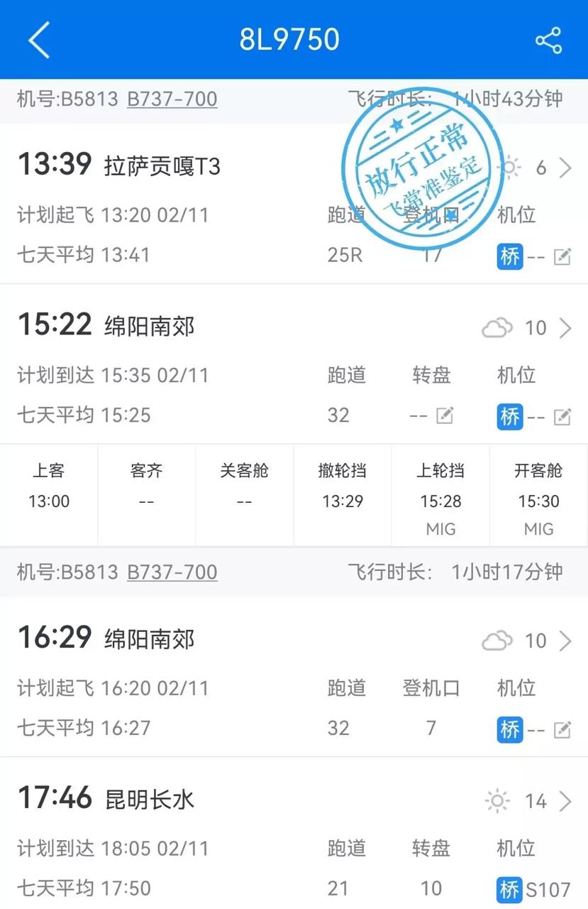 根据飞常准数据显示,2月11日,PN6392航班于13:48从拉萨贡嘎起飞,15:55到达重庆江北机场。