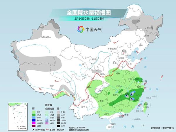 今天(2月10日)中东部今年以来范围最大、强度最强雨雪天气过程进入收尾阶段,明天起随着较强冷空气来袭,新一轮降水又将无缝衔接,江南中北部等地部分地区有大雨,局地暴雨,西北地区东部、华北西部等地有降雪。雨雪在线的同时,中东部大部地区有4~8℃降温,局地10℃以上。