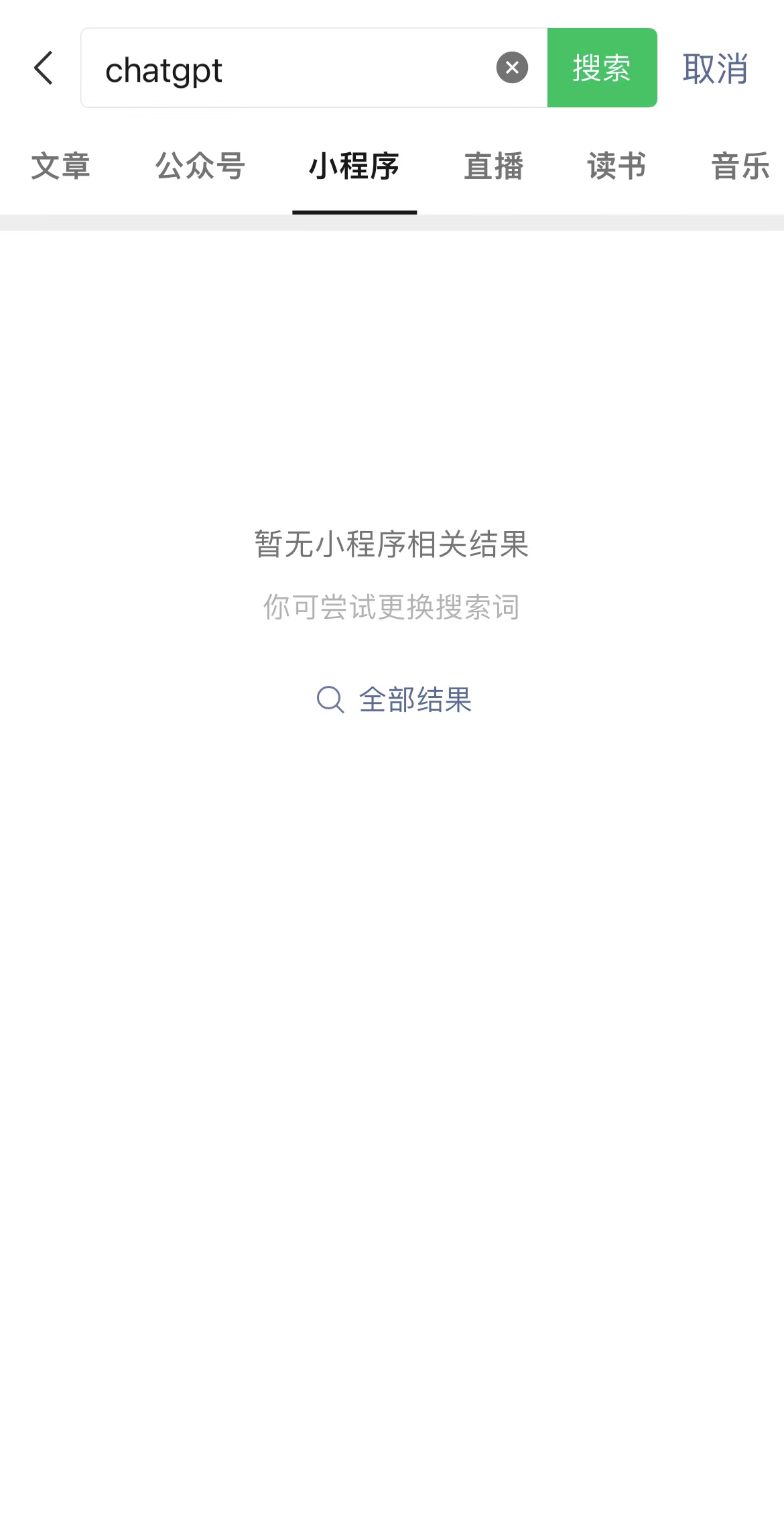 现在,在淘宝搜索“ChatGPT”等关键词显示的是“没有找到相关宝贝”。在微信小程序搜索“ChatGPT”等关键词则显示“暂无小程序相关结果”。