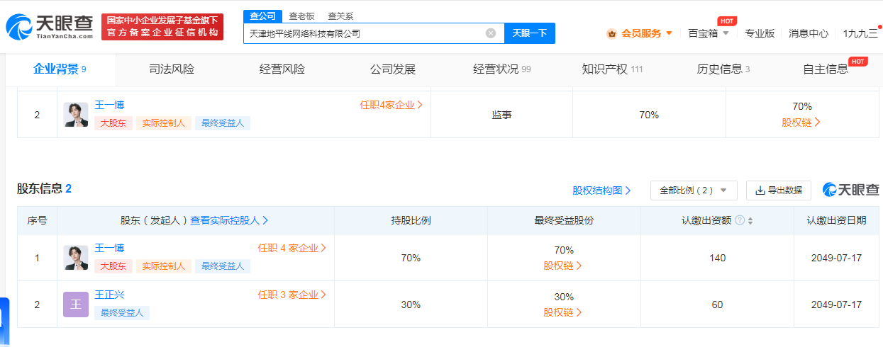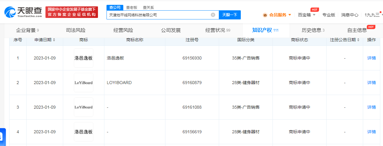 天眼查App显示,近日,天津地平线网络科技有限公司申请注册“LOYIBOARD”和“洛邑逸板”商标,国际分类为广告销售、健身器材,当前商标状态均为申请中。该公司成立于2019年8月,王一博持有70%股份,为疑似实际控制人,同时任监事一职。