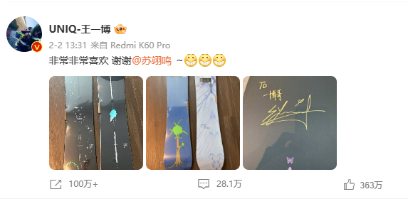 目前,尚不确定上述商标是否为滑板品牌。据此前媒体报道显示,王一博非常喜欢玩滑板,还被授予“中国滑板运动推广大使”称号。几天前,王一博在微博晒出苏翊鸣送的签名滑板,称“非常非常喜欢”。