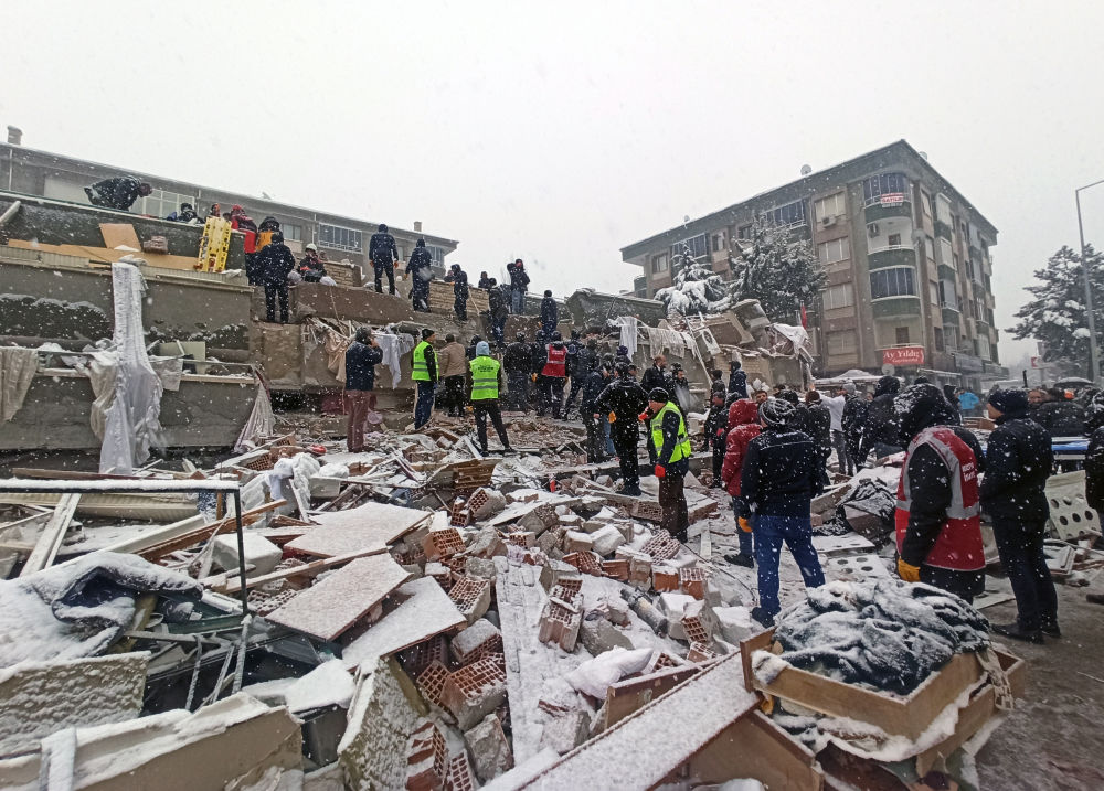 ↑人们在土耳其马拉蒂亚倒塌的建筑上搜救。新华社发(穆斯塔法·卡亚摄)