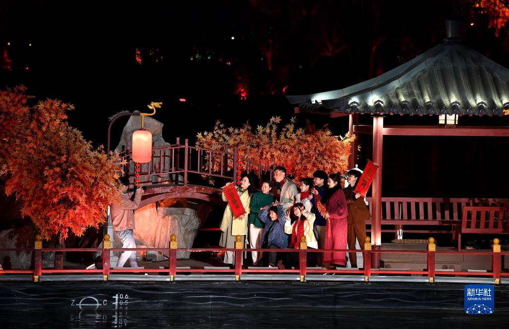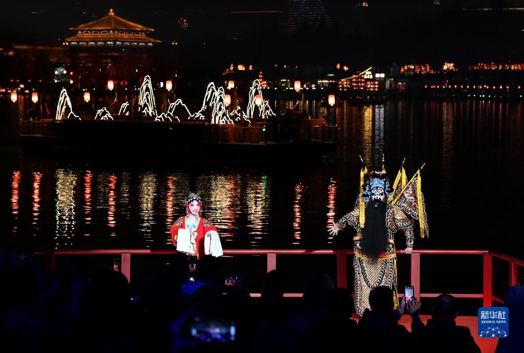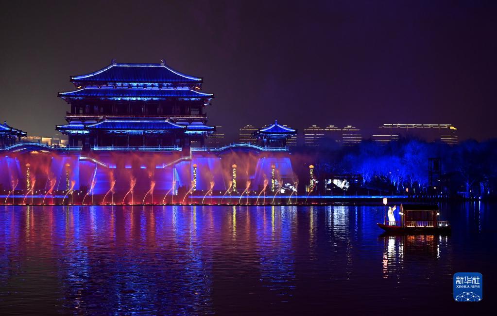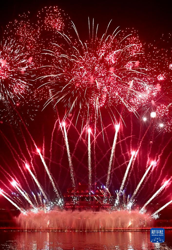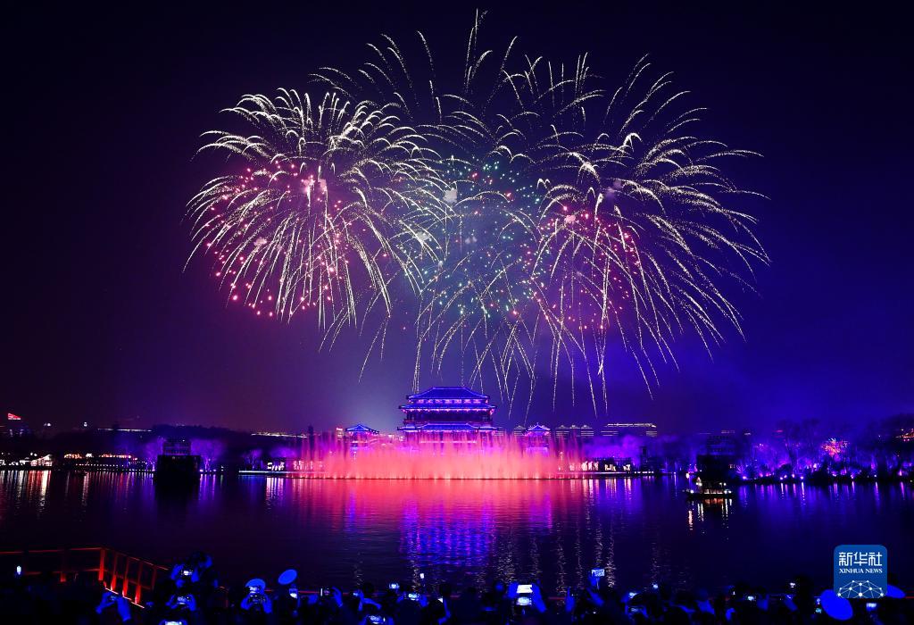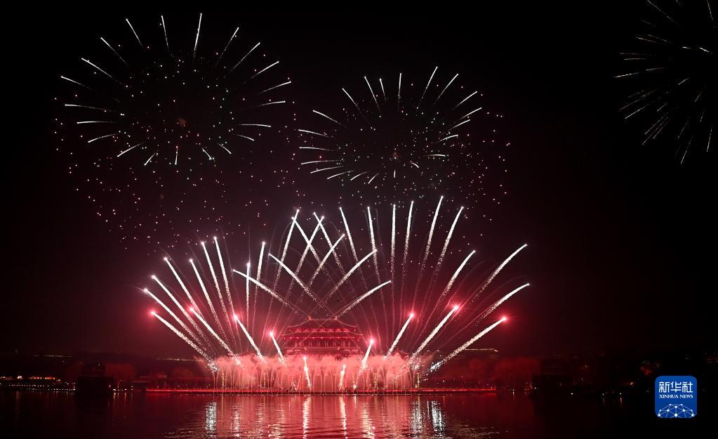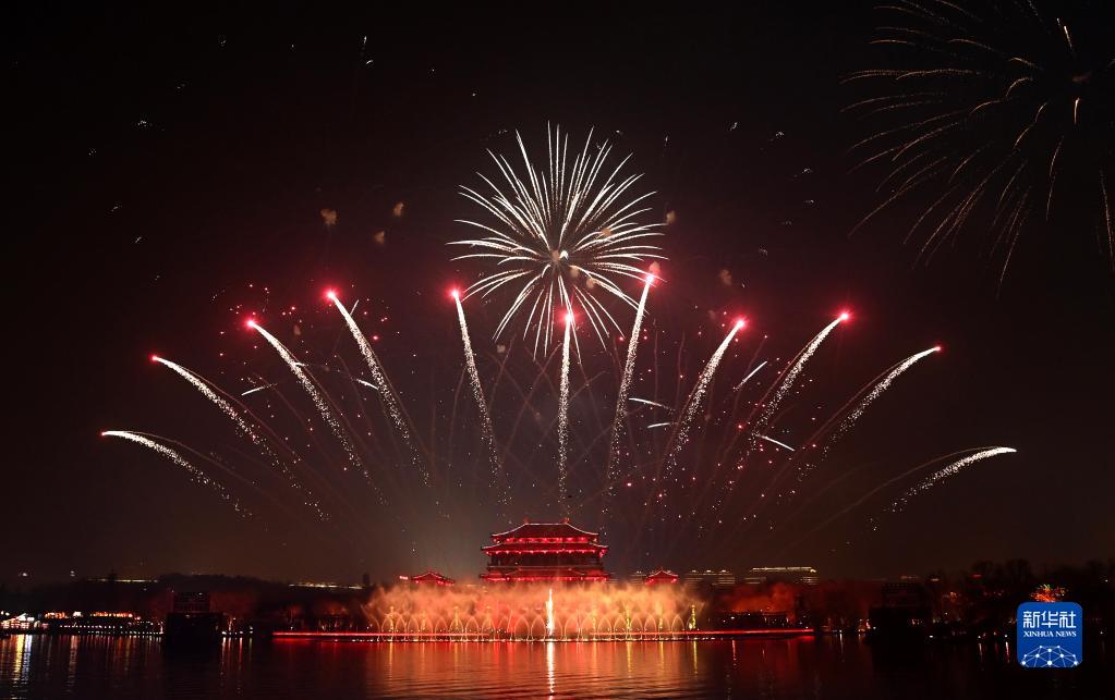 2月5日晚,2023西安曲江上元烟花晚会在大唐芙蓉园举行。晚会上灯在水里游、人在船中舞、焰火漫天空,西安市劳模及先进工作者、公安和消防及医护人员等社会各界人士代表千余人和3000名市民代表相聚观演。