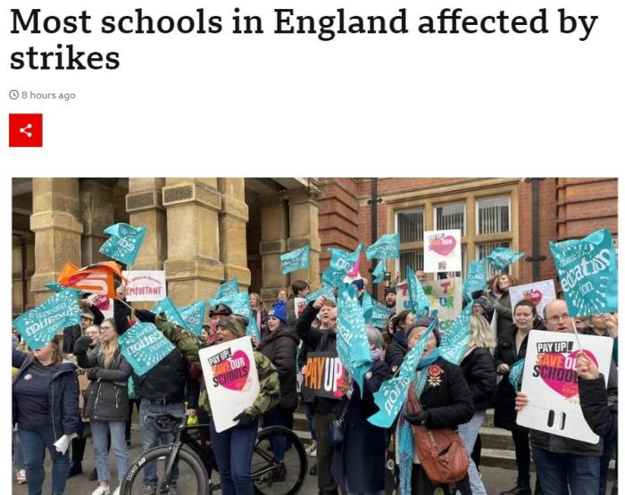 英国首相苏纳克对罢工导致学生停课进行谴责。他说,“我们孩子的教育是宝贵的,他们今天应该在学校接受教育。” 英国教育大臣基冈也称,她对教师们的离开感到“失望”。