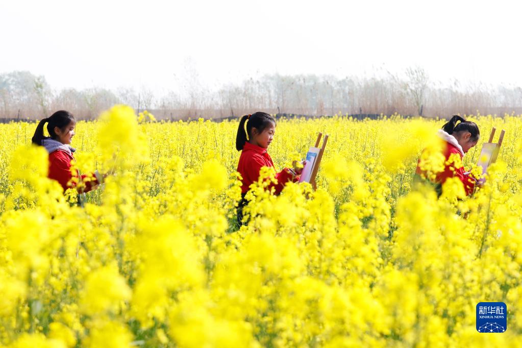 3月28日,江苏省泗洪县龙集中心小学的学生在一片油菜田里写生。