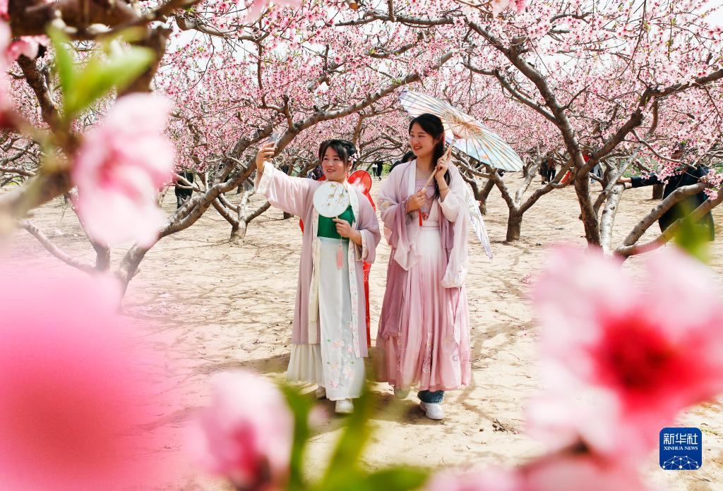 3月28日,在河南省开封市尉氏县张市镇万亩桃园,游人在盛开的桃花林中赏花拍照。