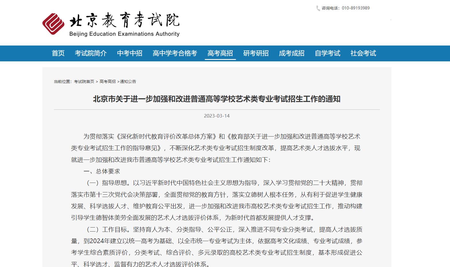 二是部分艺术类专业将取消专业能力考试。据北京教育考试院上述《通知》,2024年起,艺术史论、戏剧影视文学等高校艺术类专业,直接依据考生高考文化课成绩、参考考生综合素质评价,择优录取。
