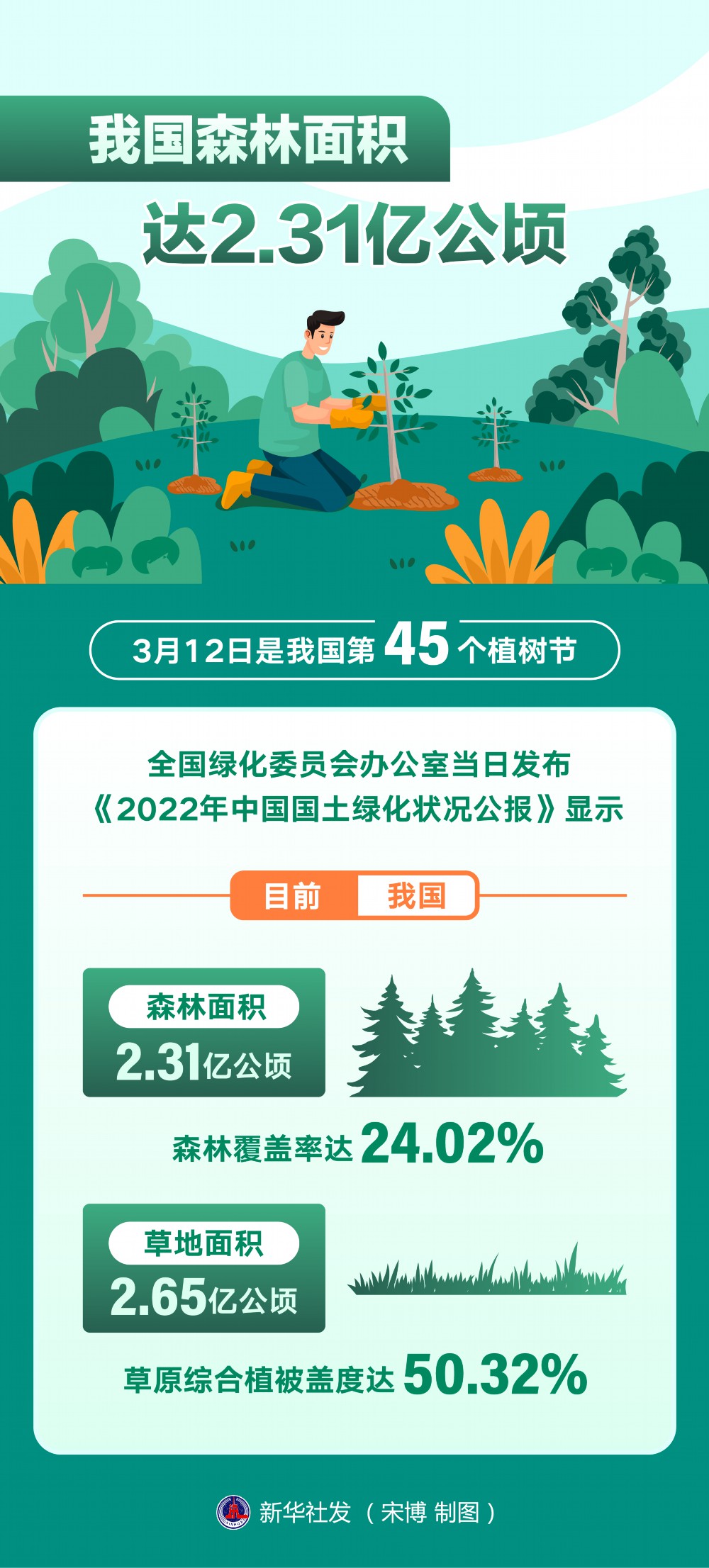 新华社北京3月12日电(记者严赋憬)3月12日是我国第45个植树节。全国绿化委员会办公室当日发布《2022年中国国土绿化状况公报》显示,目前,我国森林面积2.31亿公顷,森林覆盖率达24.02%;草地面积2.65亿公顷,草原综合植被盖度达50.32%。