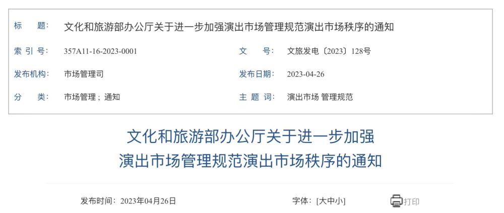 通知要求,重点加强大型演出活动现场监管。对临时搭建舞台、看台的演唱会、音乐节等大型演出活动,文化和旅游行政部门要做好演出现场监管,查验演出举办单位的演出批准文件及相关手续,核验演员信息及演出节目内容,严禁擅自变更演员及演出内容,严禁假唱、假演奏等违法违规行为。要配合公安部门做好现场安全管理,坚决防范演出安全事故发生。