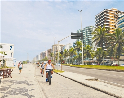 在巴西里约热内卢巴哈区一处海滩旁的街道上,游客在骑行游览。 人民日报记者 宋亦然摄