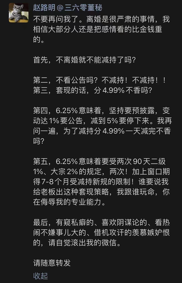 三六零董秘赵路明发朋友圈称,“离婚是很严肃的事情,我相信大部分人还是把感情看的比金钱重的。首先,不离婚就不能减持了吗?”