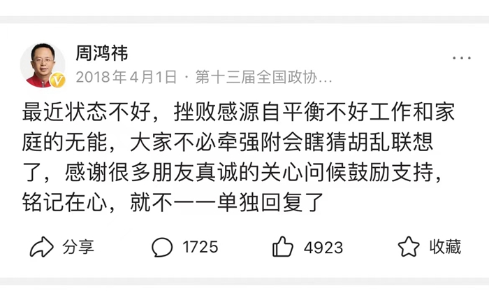 不过在周鸿祎带领企业回归A股“高光”后不久,2018年3月31日,周鸿祎突然在朋友圈感慨人生失败,没有任何意义。当时外界传闻周鸿祎婚姻出现一些问题。