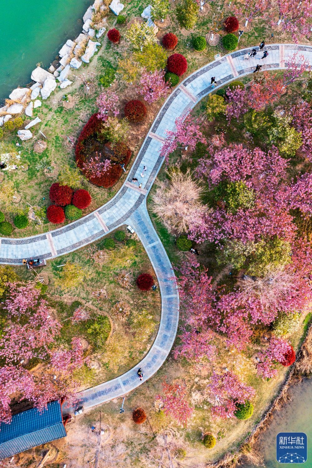 4月1日,人们在河南省商丘市日月湖景区樱花岛赏樱游玩(无人机照片)。