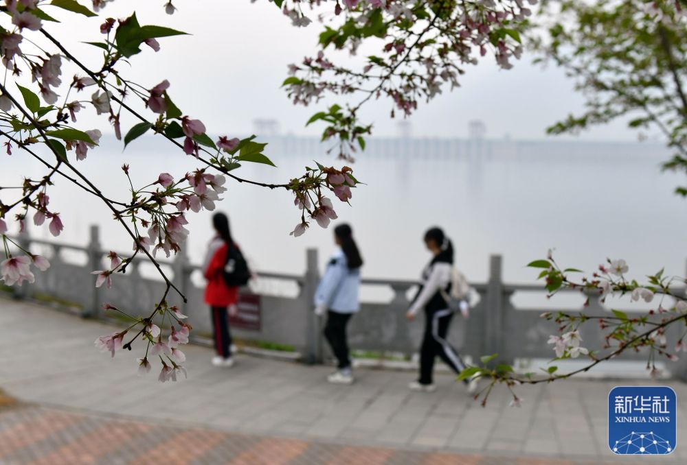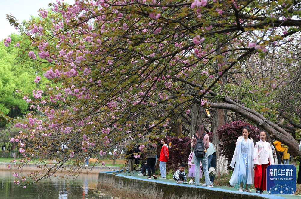 4月2日,在湖南省湘潭市,人们在湖南科技大学樱花园里游玩赏花。