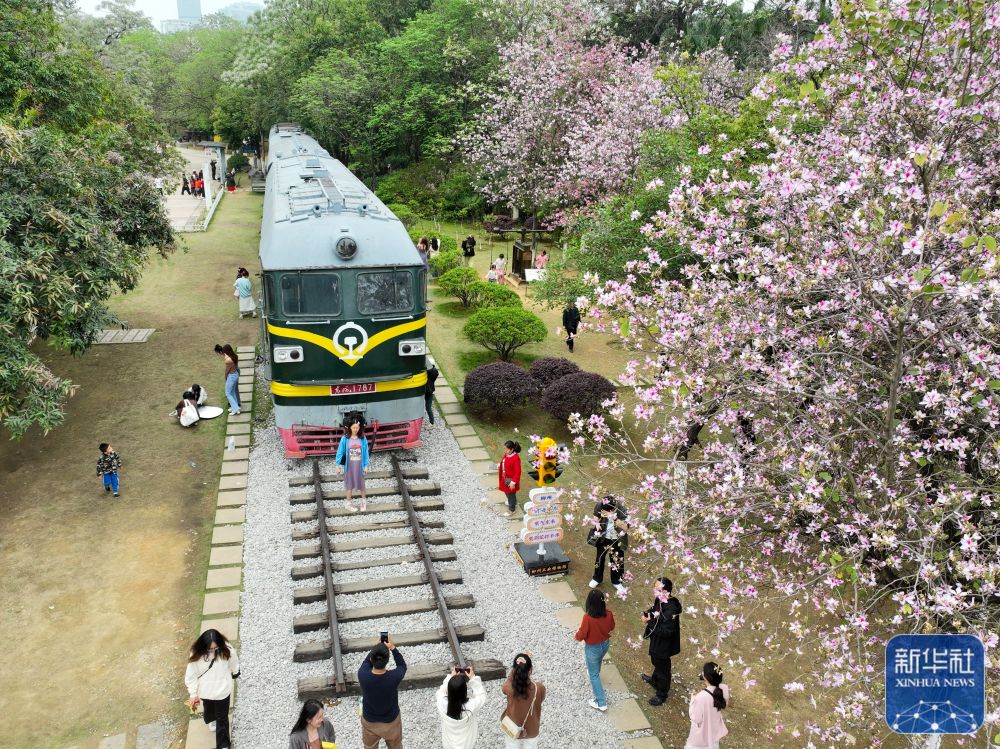 4月1日,在广西柳州市工业博物馆,市民在花下游玩(无人机照片)。
