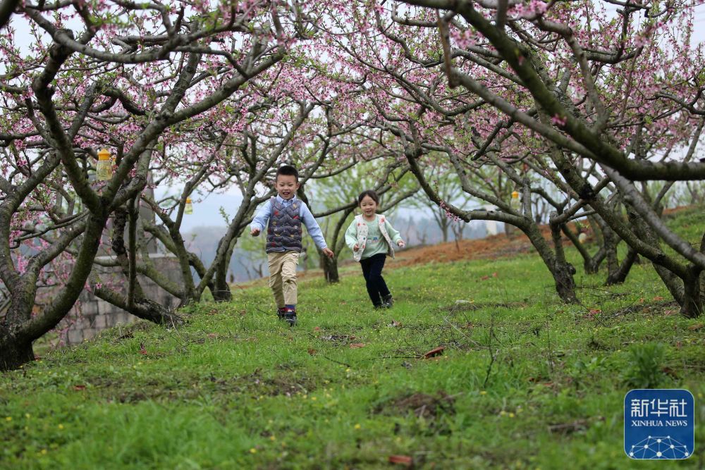 4月2日,在贵州省铜仁市玉屏侗族自治县皂角坪街道瓮阳村,小朋友在花间奔跑。