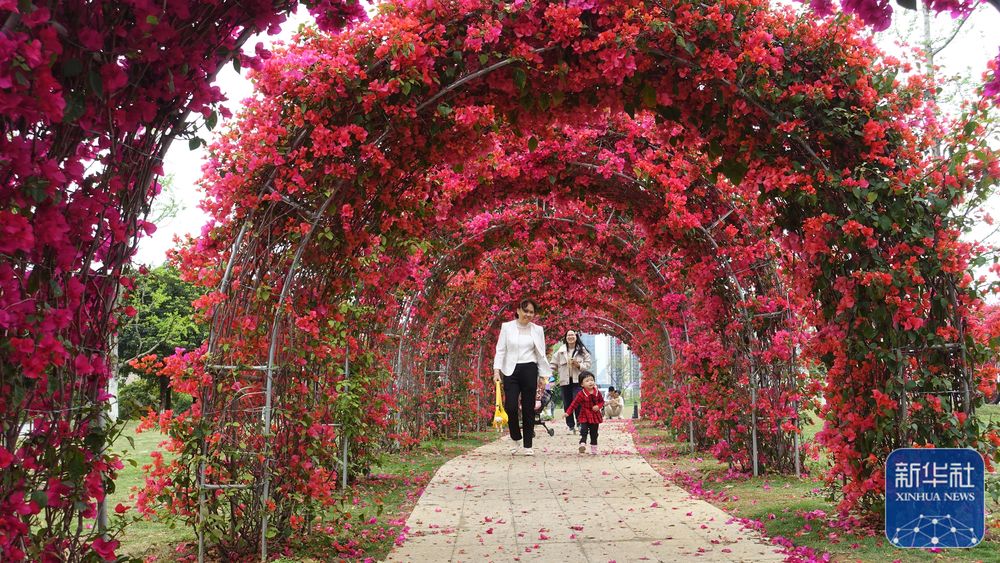 4月2日,游人在广西贺州市爱莲湖公园踏春游玩。新华社发(廖祖平摄)