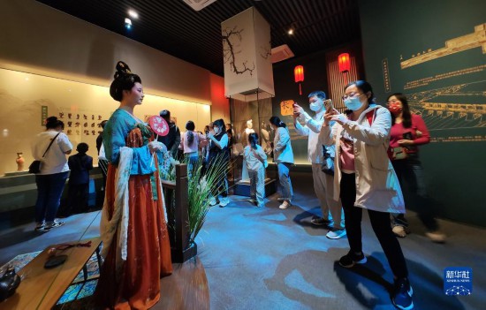 5月22日晚,游客在西安博物院《长安有故里——丝路少年大唐行》展览上参观。