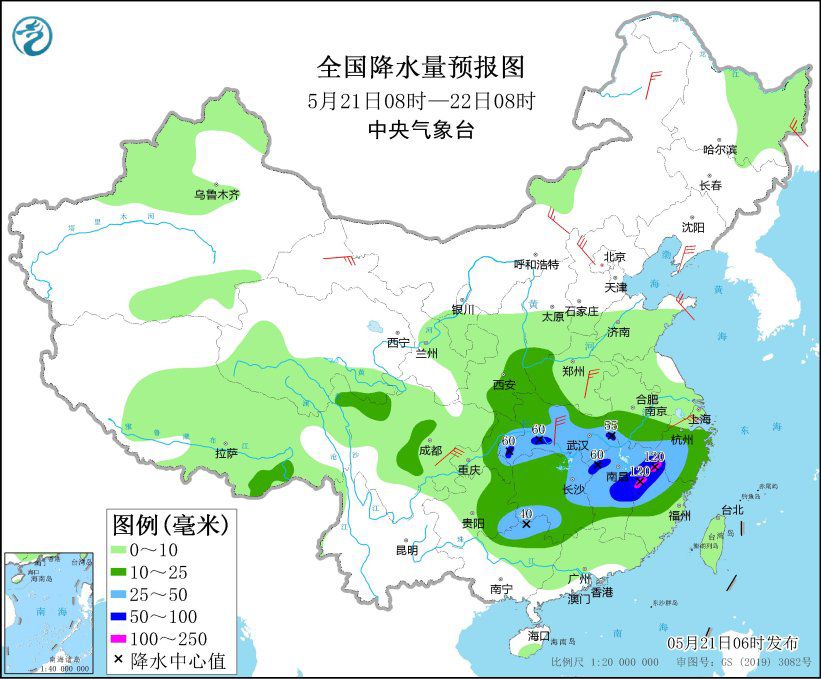 预计,5月21日08时至22日08时,重庆东部、湖北中南部、湖南北部和东部及西南部、安徽南部、江西中北部、浙江西部、福建西部以及广西东北部、贵州东南部等地部分地区有大到暴雨,其中,江西东北部、浙江西南部、福建西部等地局地有大暴雨(100~120毫米)。上述部分地区伴有短时强降水(最大小时降雨量20~50毫米,局地可超过60毫米),局地有雷暴大风、冰雹等强对流天气。中央气象台5月21日06时继续发布暴雨蓝色预警。