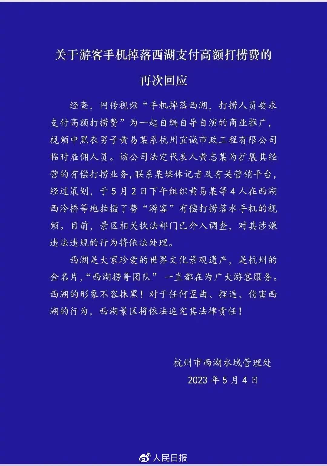 今年“五一”期间,一则关于游客手机掉进西湖,打捞人员要价1500元的视频,在网络上引发热议。杭州市西湖水域管理处近日就此回应,表示网传视频为一起自编自导自演的商业推广。目前,景区执法部门已介入调查,对涉嫌违法违规的行为将依法处理。