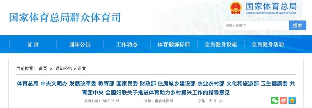 近日,国家体育总局会同中央精神文明建设办公室、国家发展改革委、教育部、国家民委、财政部、住房城乡建设部、农业农村部、文化和旅游部、国家卫生健康委、共青团中央、全国妇联等部委印发了《关于推进体育助力乡村振兴工作的指导意见》(以下简称《意见》),协力推进体育助力乡村振兴工作。
