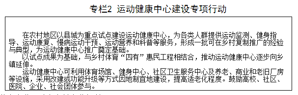 (七)深入开展运动促进健康行动。广泛开展“体育进乡村,运动促健康”科普活动和“健康中国 母亲行动”,提升农民体育健康素养。加强乡村医生科学健身指导能力和体卫融合技能培训。推动体卫融合服务机构向乡村覆盖延伸,支持乡村医疗卫生机构提供科学健身指导服务。实施运动健康中心建设工程,以改扩建为主要方式建立一批运动健康中心,推动建立体育和卫生健康等部门协同、全社会共同参与的运动促进健康新模式。优化国民体质监测和科学健身指导服务,研究完善适合农民的运动项目库、健身指导方案和健身活动指南。充分发挥体育的健康促进作用,促进乡村学龄儿童和老年人身心健康。研究推广适合老年人的体育健身休闲项目、方式和方法,发挥运动在老年人慢性病防控中的积极作用,发布老年人体育健身活动指南。