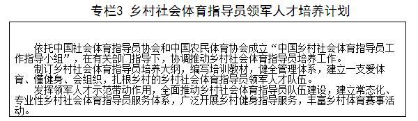 (十一)加强乡村体育人才队伍建设。建立健全乡村社会体育指导员培训体系和工作机制。各级社会体育指导员的考核认定工作向回乡创业大学生、乡村体育教师等各类体育人才倾斜。建立乡村体育人才信息数据库。加大乡村社会体育指导员领军人才和乡村体育骨干人才培养。开展体育专业院校毕业生基层成长计划、体育人才下乡支教等专项活动,引导体育专门人才更好地在农村就业创业。建立人才激励机制,定期在全国群众体育先进表彰中推选乡村体育工作先进典型,增强乡村体育工作者的荣誉感和责任感。