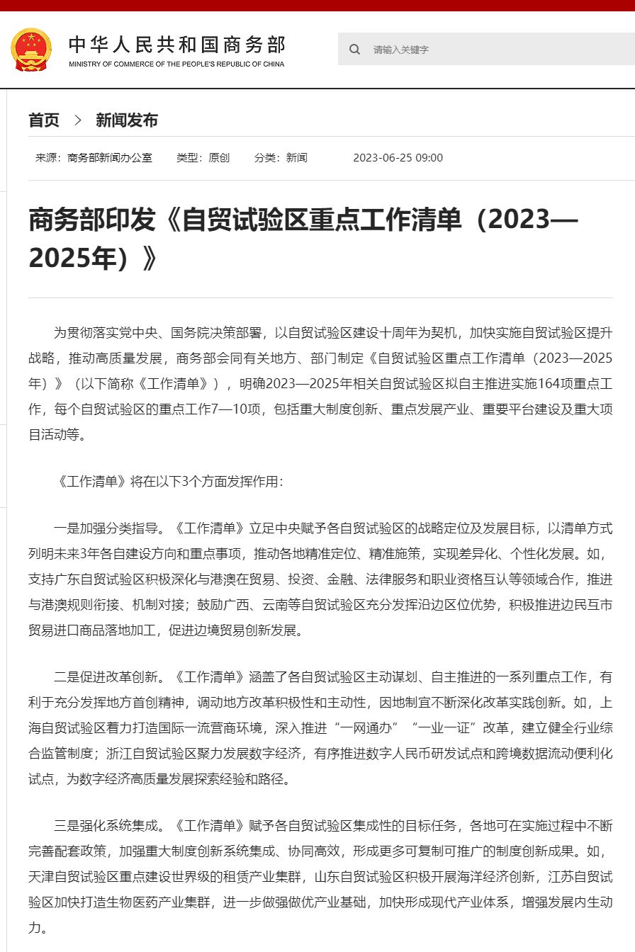 央视网消息:据商务部,为贯彻落实党中央、国务院决策部署,以自贸试验区建设十周年为契机,加快实施自贸试验区提升战略,推动高质量发展,商务部会同有关地方、部门制定《自贸试验区重点工作清单(2023—2025年)》(以下简称《工作清单》),明确2023—2025年相关自贸试验区拟自主推进实施164项重点工作,每个自贸试验区的重点工作7—10项,包括重大制度创新、重点发展产业、重要平台建设及重大项目活动等。