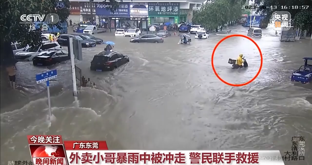 广东东莞:外卖小哥暴雨中被冲走 警民联手救援