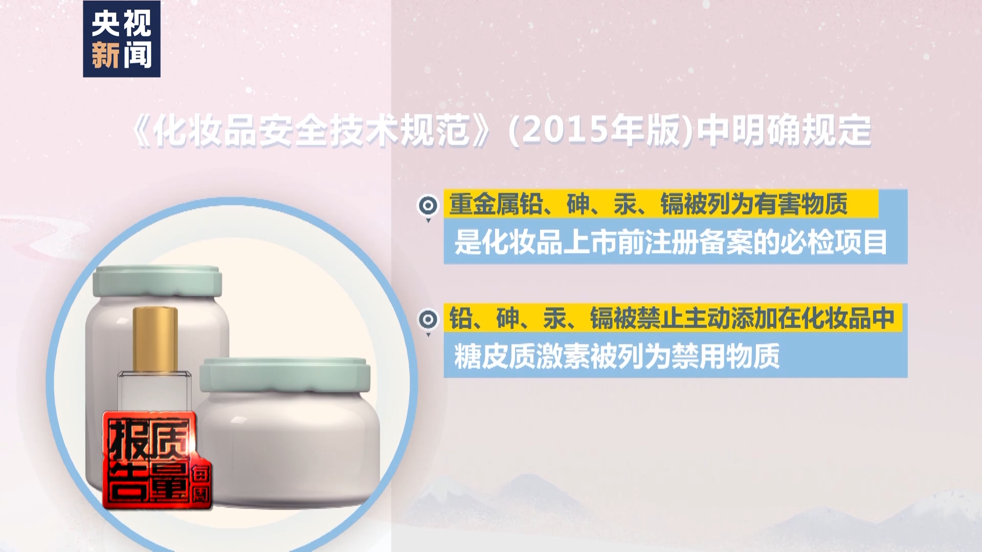 检测专家向记者介绍,《化妆品安全技术规范》(2015年版)中明确规定,重金属铅、砷、汞、镉被列为有害物质,是化妆品上市前注册备案的必检项目。铅、砷、汞、镉被禁止主动添加在化妆品中,糖皮质激素被列为禁用物质。