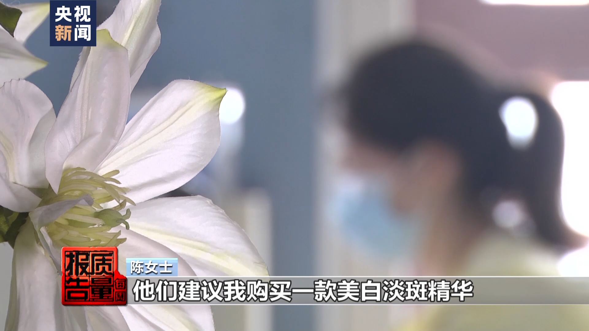 陈女士:在他们店做清洁补水的项目,他们建议我购买一款美白淡斑的精华,说我这个皮肤有一点点色斑,就在右边。用他们的产品可以有淡斑还有预防新的斑长出来的效果,而且那个产品他们说是纯中药提取的,所以我当时听了很心动。