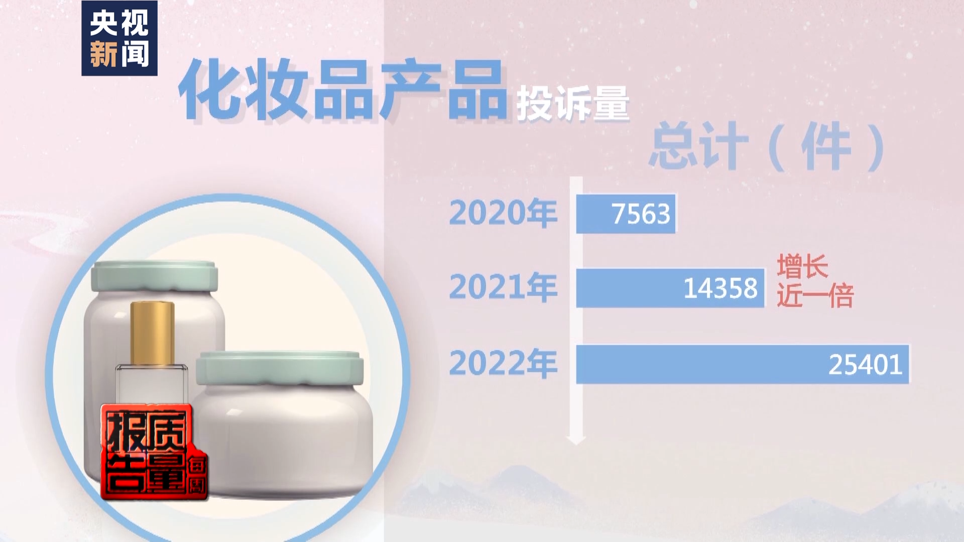 中国消费者协会提供给记者的数据显示,2020年至2022年有关化妆品产品投诉量呈明显上升趋势。2020年有关化妆品产品投诉总计7563件,2021年有关化妆品产品投诉总计14358件,增长了近一倍,到了2022年,投诉量就增长到了25400多件(25401件)。