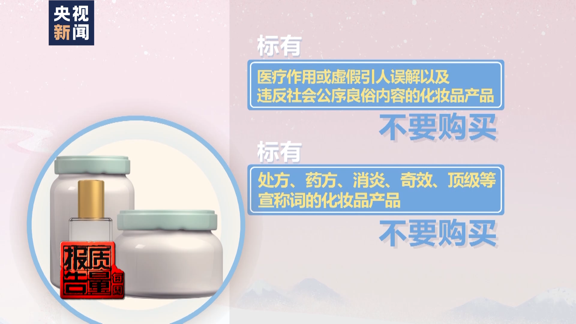 其中着重强调:在选择产品时应注意标签的宣称内容,标有医疗作用或虚假引人误解以及违反社会公序良俗内容的产品不要购买。这类宣称词一般为处方、药方、消炎、奇效、顶级等,都是化妆品销售时禁止宣称的内容。