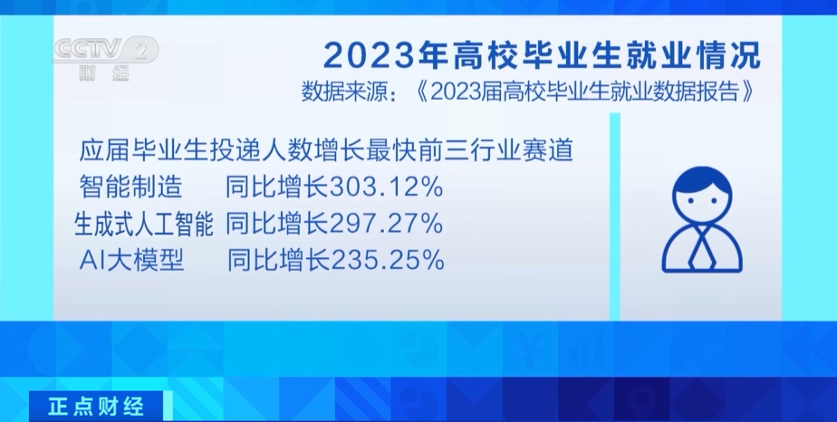 《2023届高校毕业生就业数据报告》显示,在应届毕业生投递人数增长最快的前十大行业赛道中,智能制造、AIGC(生成式人工智能)、AI大模型排名前三,同比增长303.12%、297.27%、235.25%。