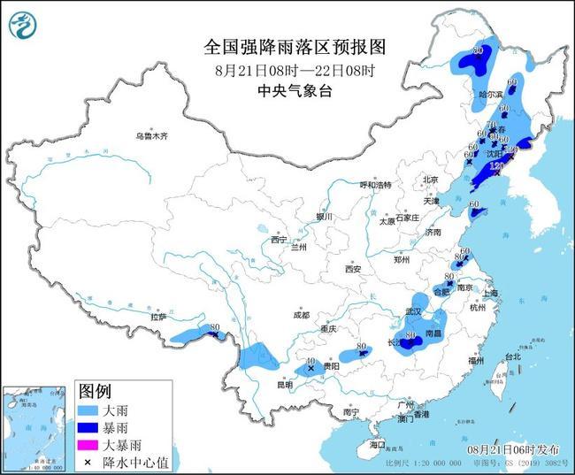 中央气象台8月21日6时继续发布暴雨蓝色预警: