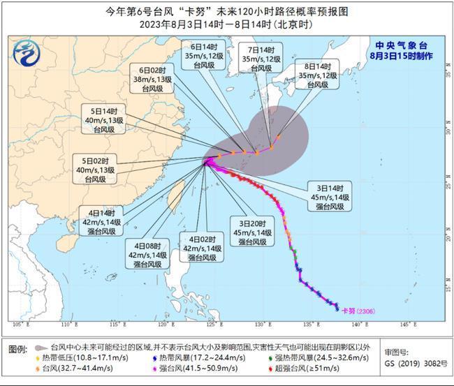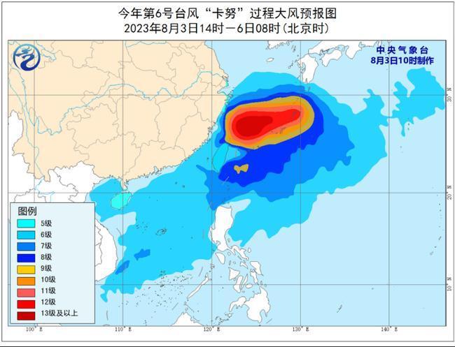 大风预报:受“卡努”和季风共同影响,8月3日至5日,北部湾、南海、台湾海峡、巴士海峡、台湾以东洋面、东海及钓鱼岛附近海域、长江口区、杭州湾、浙江沿海、福建沿海、台湾岛沿海将有6~8级、阵风9~10级的大风,其中东海、台湾以东洋面部分海域及钓鱼岛附近海域风力可达9~12级、阵风13~14级,“卡努”中心经过的附近海面风力有13~15级、阵风16~17级。