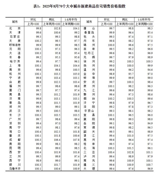 2023年8月70个大中城市新建商品住宅销售价格指数。 截图自国家统计局官网