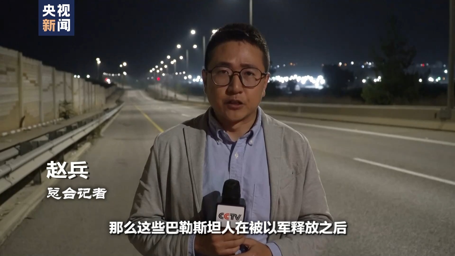 总台记者 赵兵:我现在是在巴勒斯坦约旦河西岸地区,我身后不远的位置就是以色列的奥弗军事监狱。那么这些巴勒斯坦人在被以军释放之后也是通过红十字国际委员会转运给巴勒斯坦方面,并且是直接通过我身后不远处的一个以军军事检查站进入到巴勒斯坦控制的城镇贝图尼亚,在那里他们分别被其家属接走。
