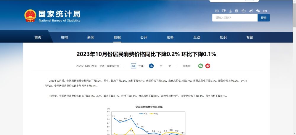 2023年10月份居民消费价格同比下降0.2% 环比下降0.1%