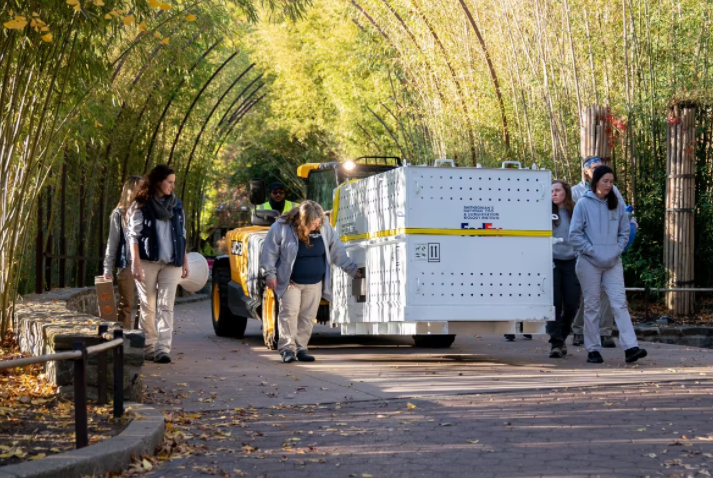 △11月8日上午,工作人员将载有大熊猫“美香”的“旅行包厢”移出华盛顿史密森学会国家动物园。