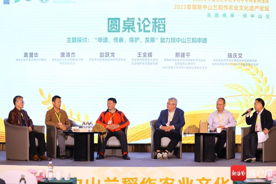 圆桌论“稻”环节由中国农业科学院作物科学研究所研究员、海南省农业农村厅GEF项目首席技术顾问杨庆文主持。农业农村部农业生态与资源保护总站首席专家王全辉,农业农村部规划设计研究院所长赵跃龙,海南省农业生态与资源保护总站站长、海南省农业农村厅GEF项目工作领导小组办公室执行主任邢建平,海南省农业科学院粮食作物研究所研究员唐清杰,海南大学热带农林学院教授袁潜华等专家参加,从“申遗、传承、保护、发展”四个方面,探讨如何助力琼中山兰稻申遗。