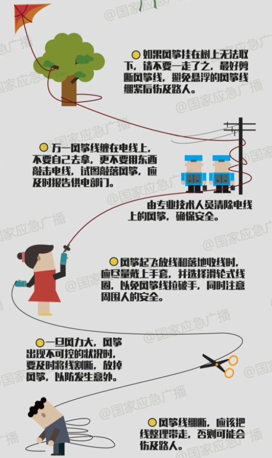 如果看见附近有人在放风筝,要提高警惕注意绕行,行人应停止奔跑,骑行者应减速慢行或下车推行。当发现风筝线离自己越来越近时,迅速向反方向躲开。