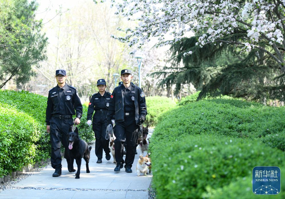 ↑4月7日,“福仔”观看战友“小黑”的扑咬训练。