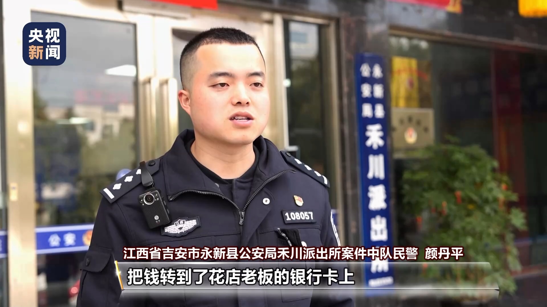 江西省吉安市永新县公安局禾川派出所案件中队民警 颜丹平:犯罪嫌疑人直接安排了人,把钱转到了花店老板的银行卡上,老板再把钱取出来。在无意识中,这个花店老板充当了境外诈骗团伙洗钱的工具人。