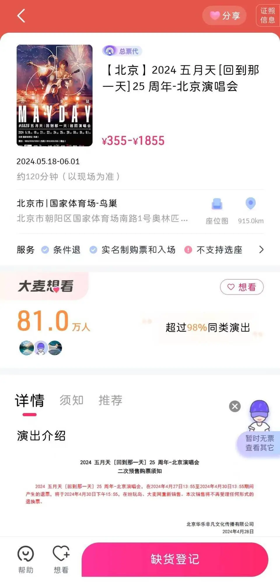 目前距离五月天鸟巢演唱会第一场时间已经很近了,从目前的售票结果来看,受到假唱风波的冲击,五月天的大众口碑虽然受到了较大的影响,但是并没有太大的影响到票务表现,五月天鸟巢演唱会十场同时开票,截至目前已经全部售罄,大麦网上有81万人点击了“想看”,超过98%同类演出。