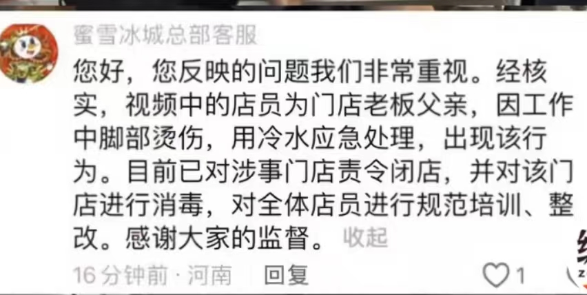 6月11日,蜜雪冰城回应称:经核实,视频中的店员为门店老板父亲,因工作中脚部烫伤,用冷水应急处理,出现该行为。目前已对涉事门店责令闭店,并对该门店进行消毒,对全体店员进行规范培训、整改。